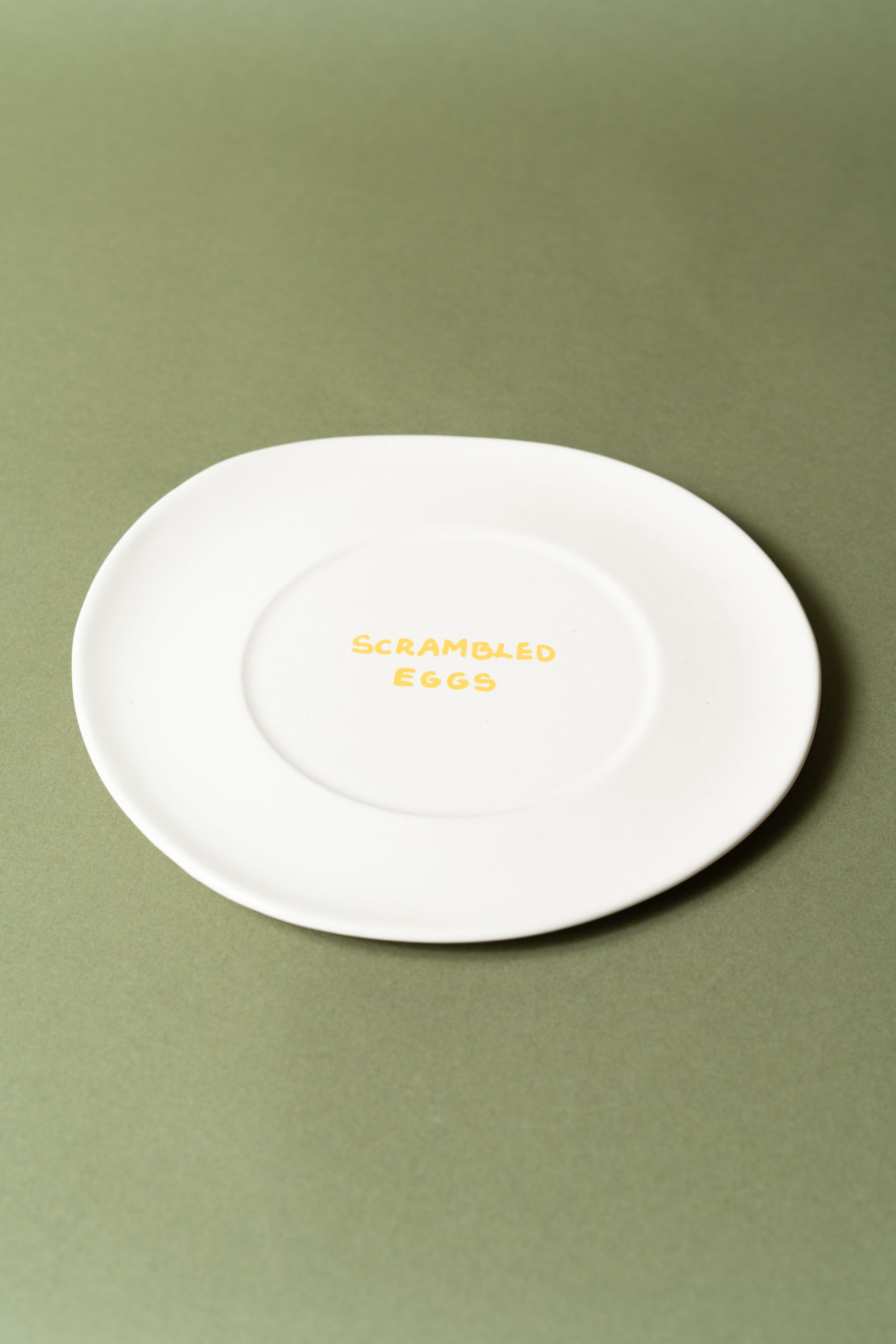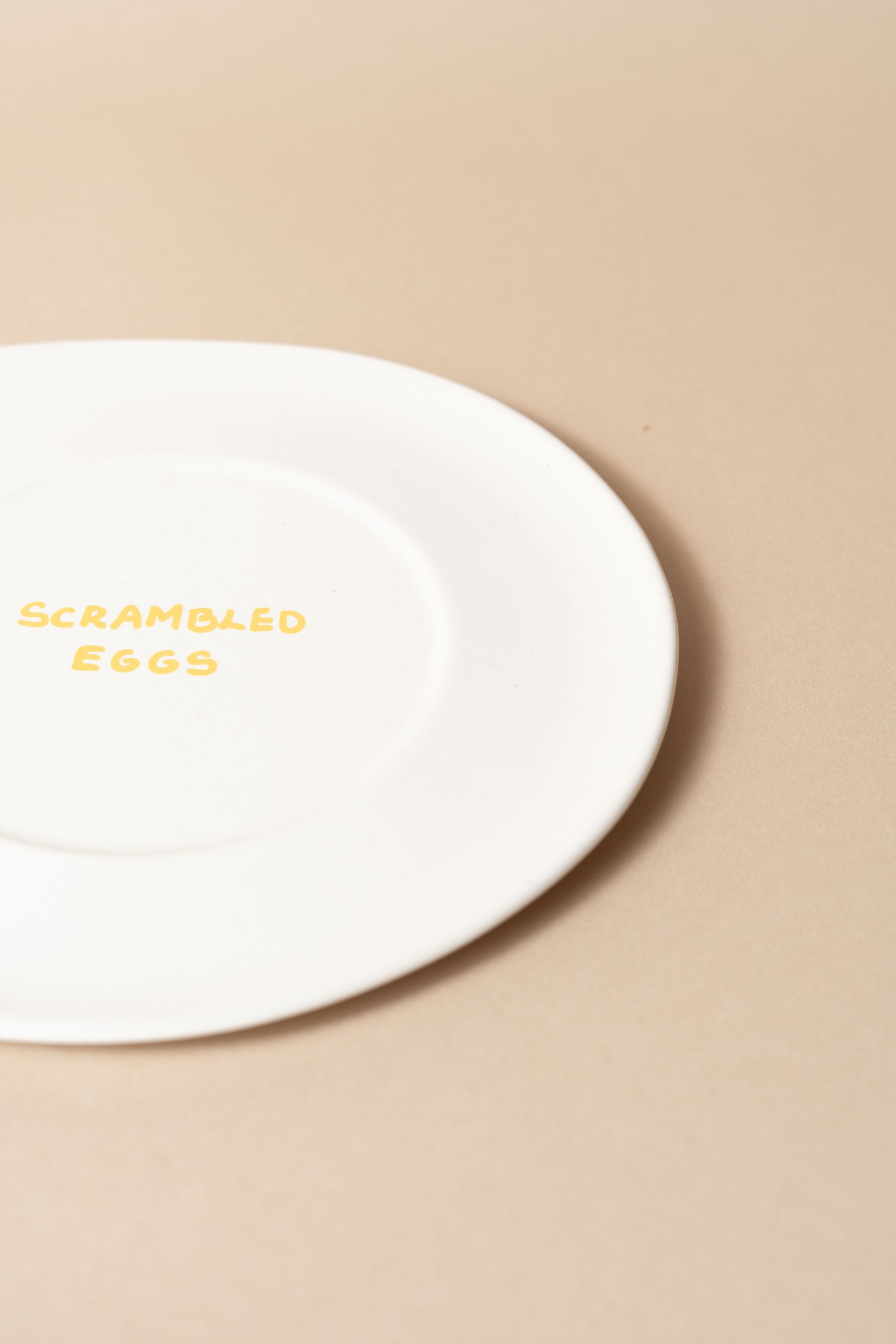 The off-white ceramic plate with a glossy finish and the text scrambled eggs I butter yellow.