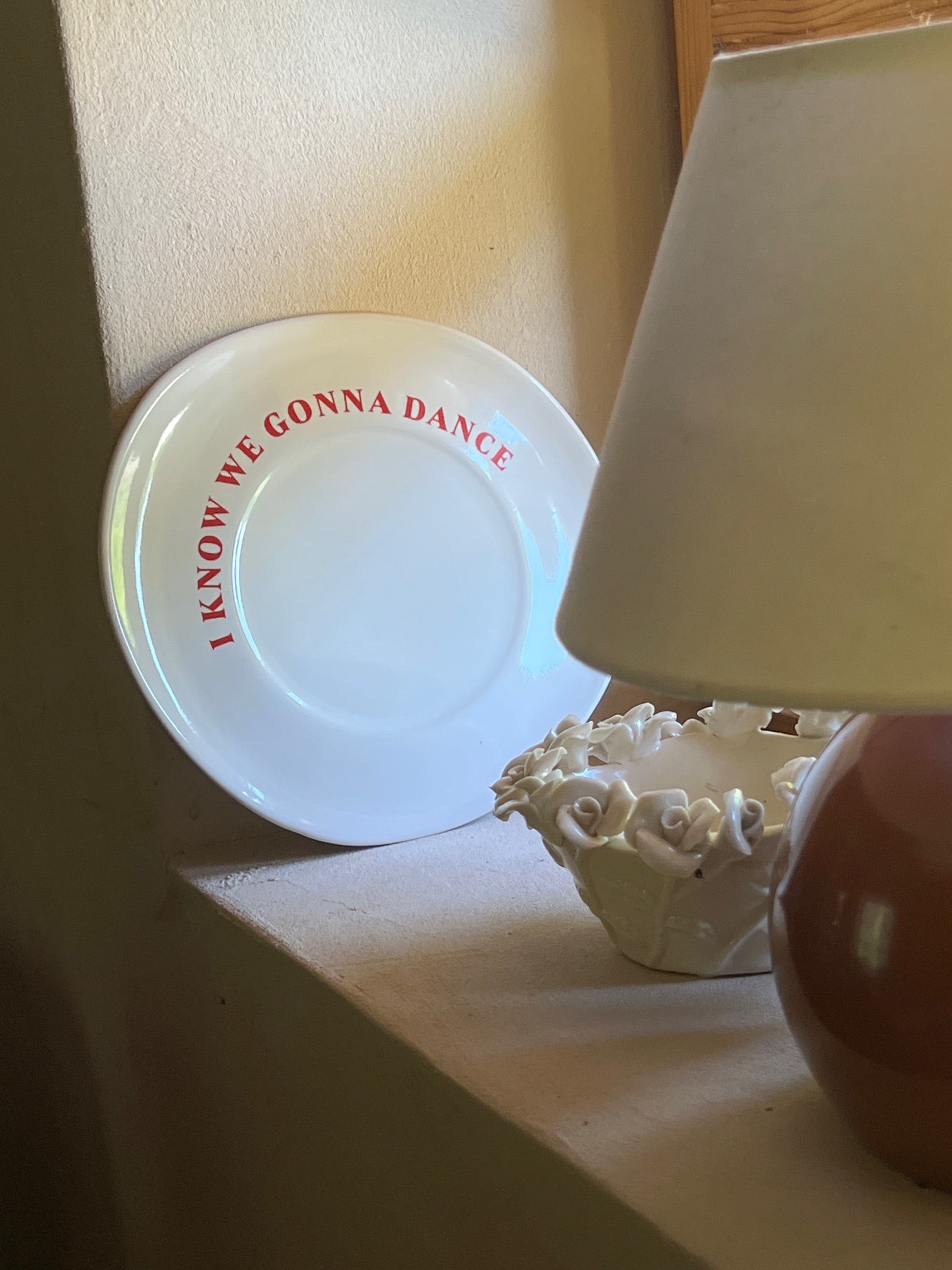 This off-white plate boasts a glossy finish and a playful red decal that reads "I know we gonna dance" in lovely script. The vibrant lettering adds a fun and cheerful touch, making it perfect for lovely meals or as a wall decoration that brings a smile.