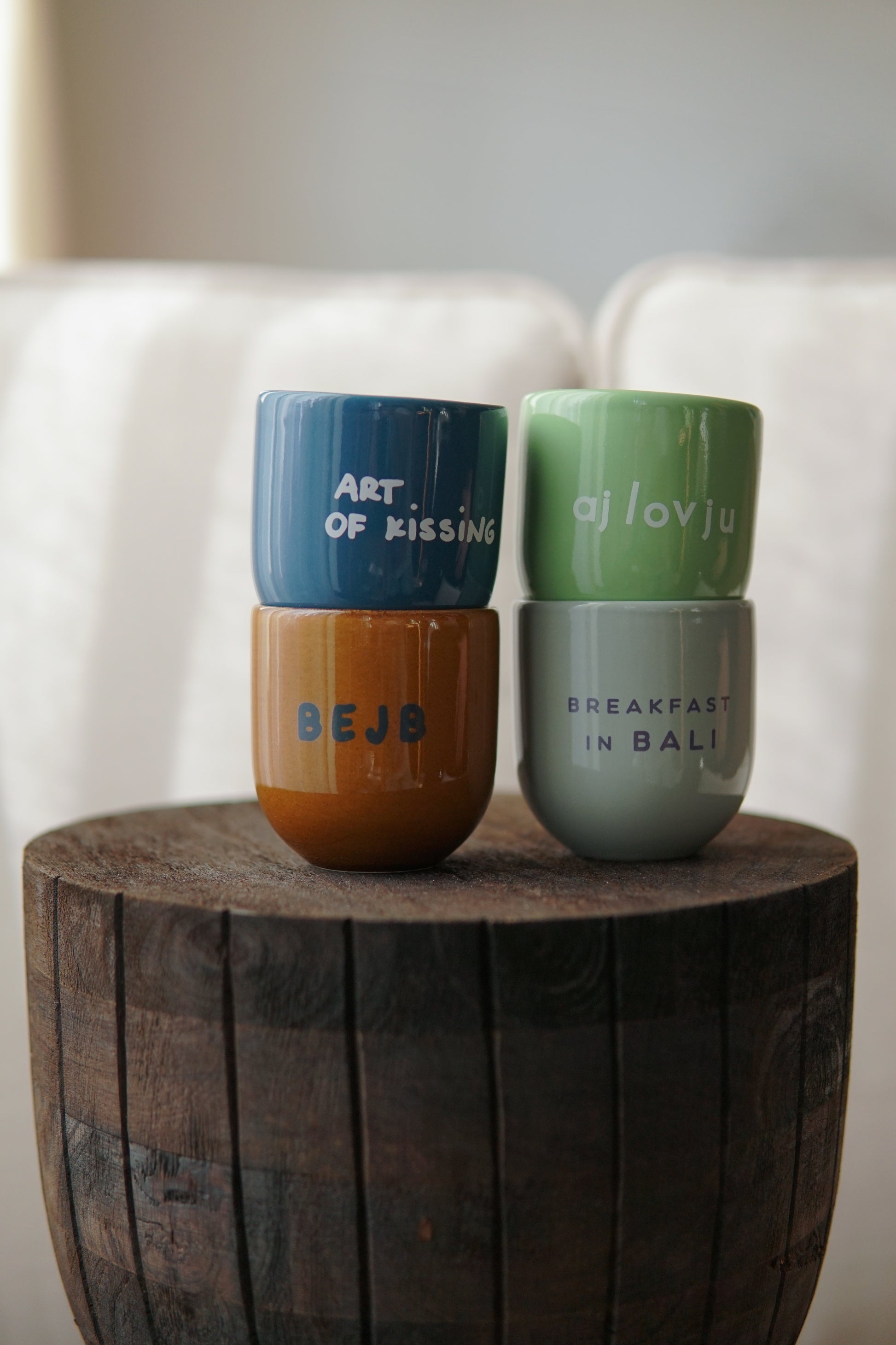 Shine caramel round 2 dcl mug, with green decal ; BEJB, which can be like ‘ hey babe ‘, to your friend, lover, girlfriend …