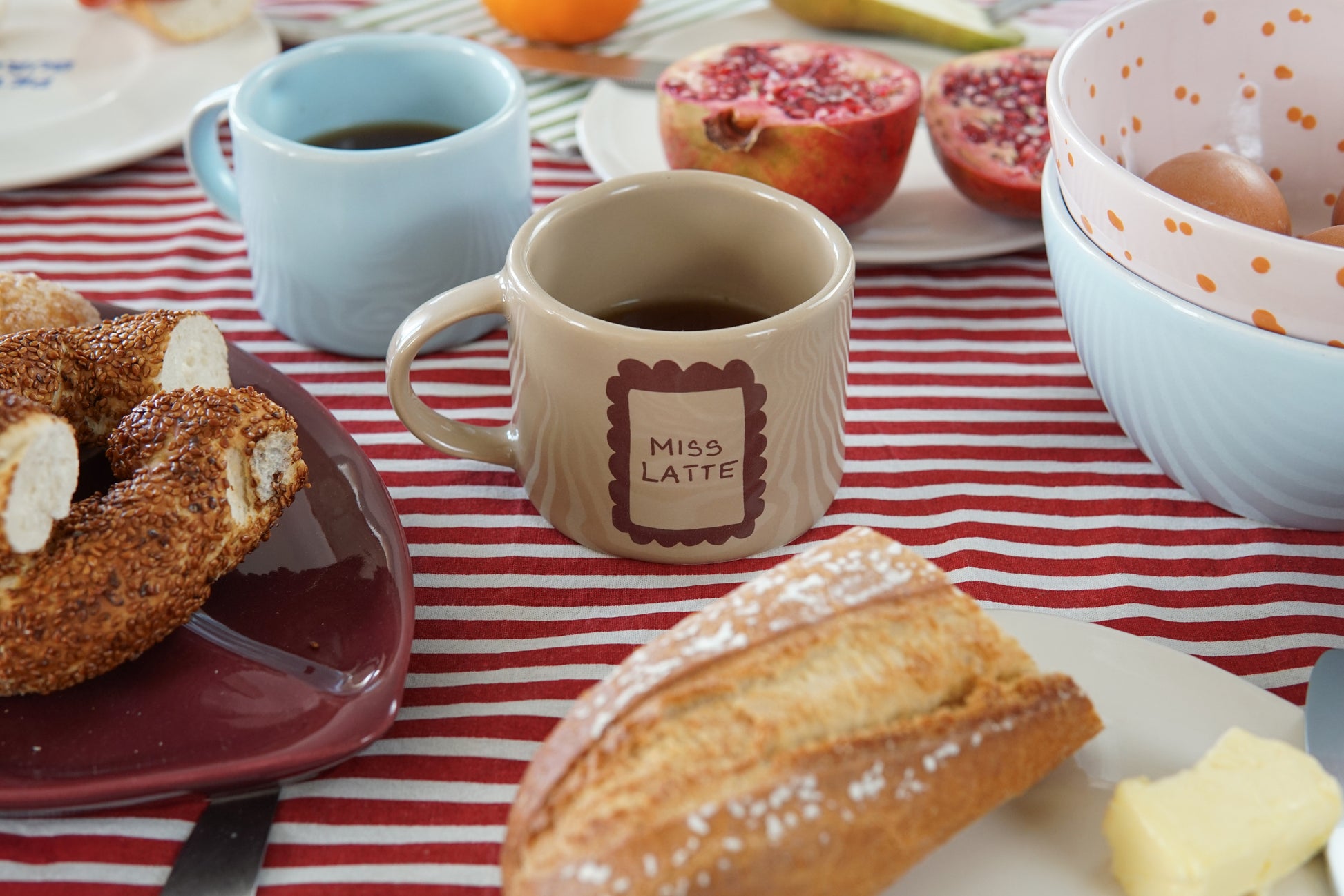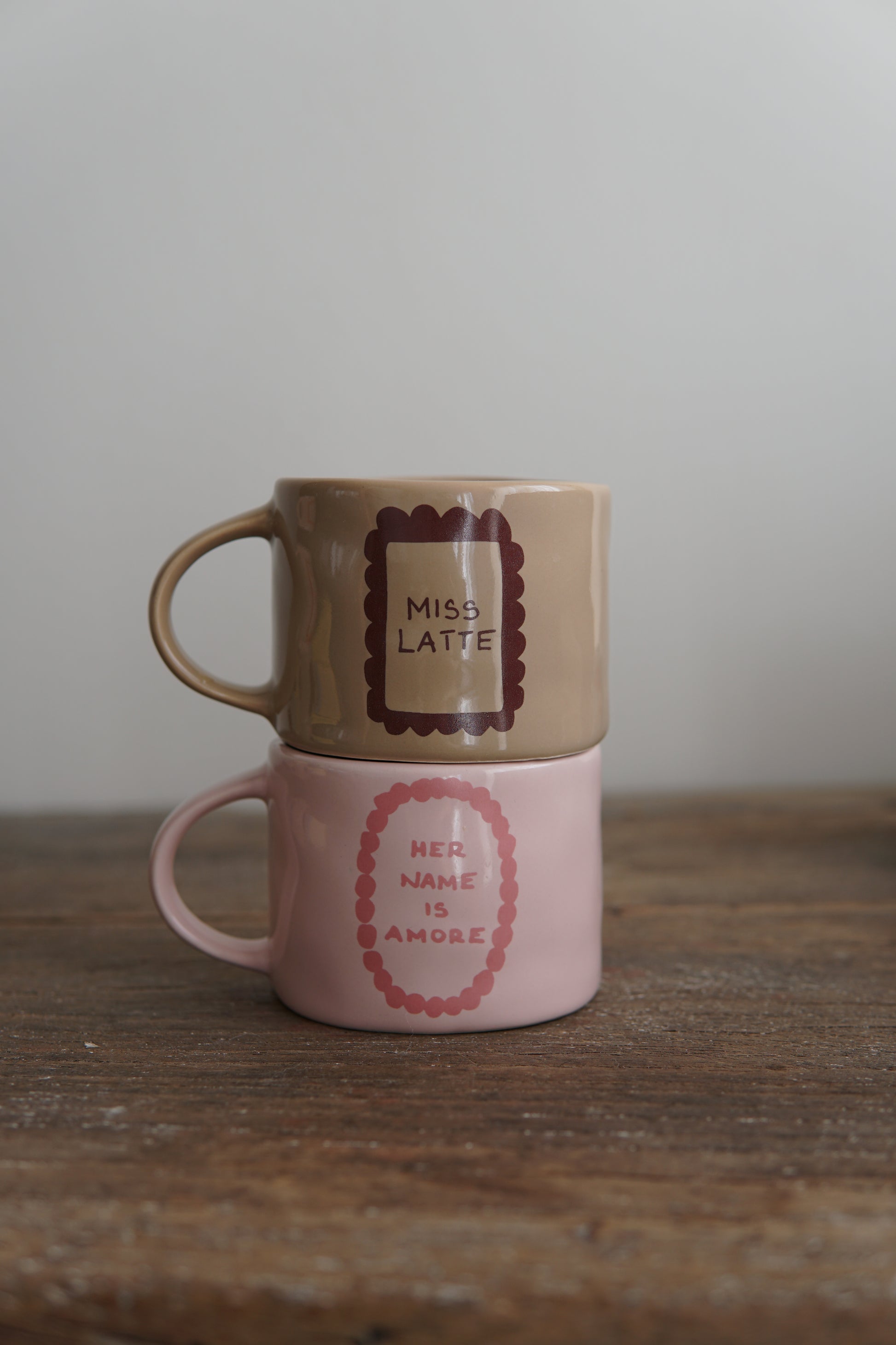This adorable beige mug with burgundy lettering is perfect for latte lovers.