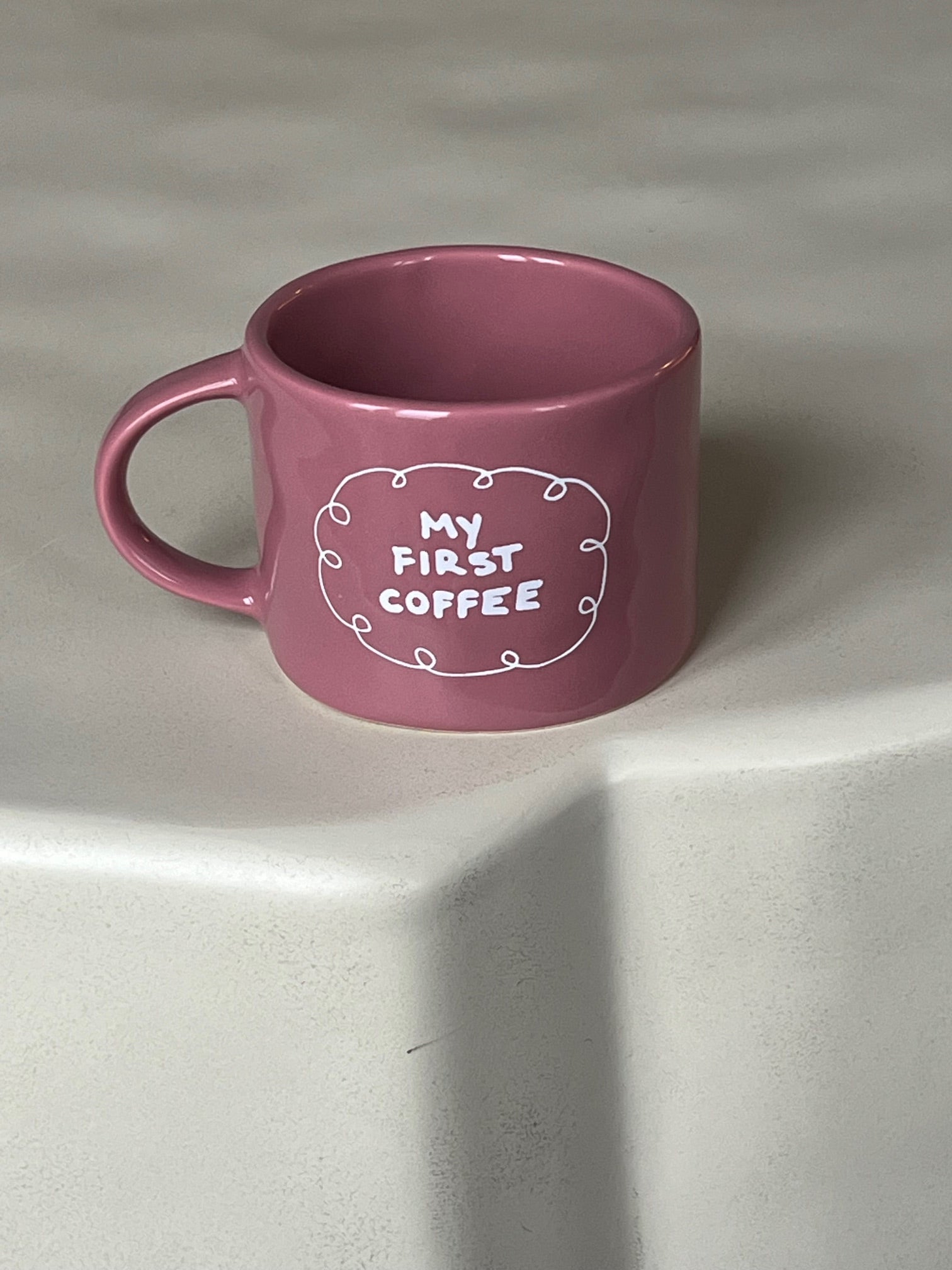 Enjoy your morning coffee or tea in style with our beautiful 2.5 dcl ceramic mug featuring a charming pink decal that reads "My First Coffee." This delightful mug comes with a convenient holder, making it perfect for showing off or keeping your coffee close at hand. The soft pink color adds a touch of elegance to your kitchen or office. Ideal for new coffee lovers and a lovely gift for friends. Start your day with a smile and a perfect cup!