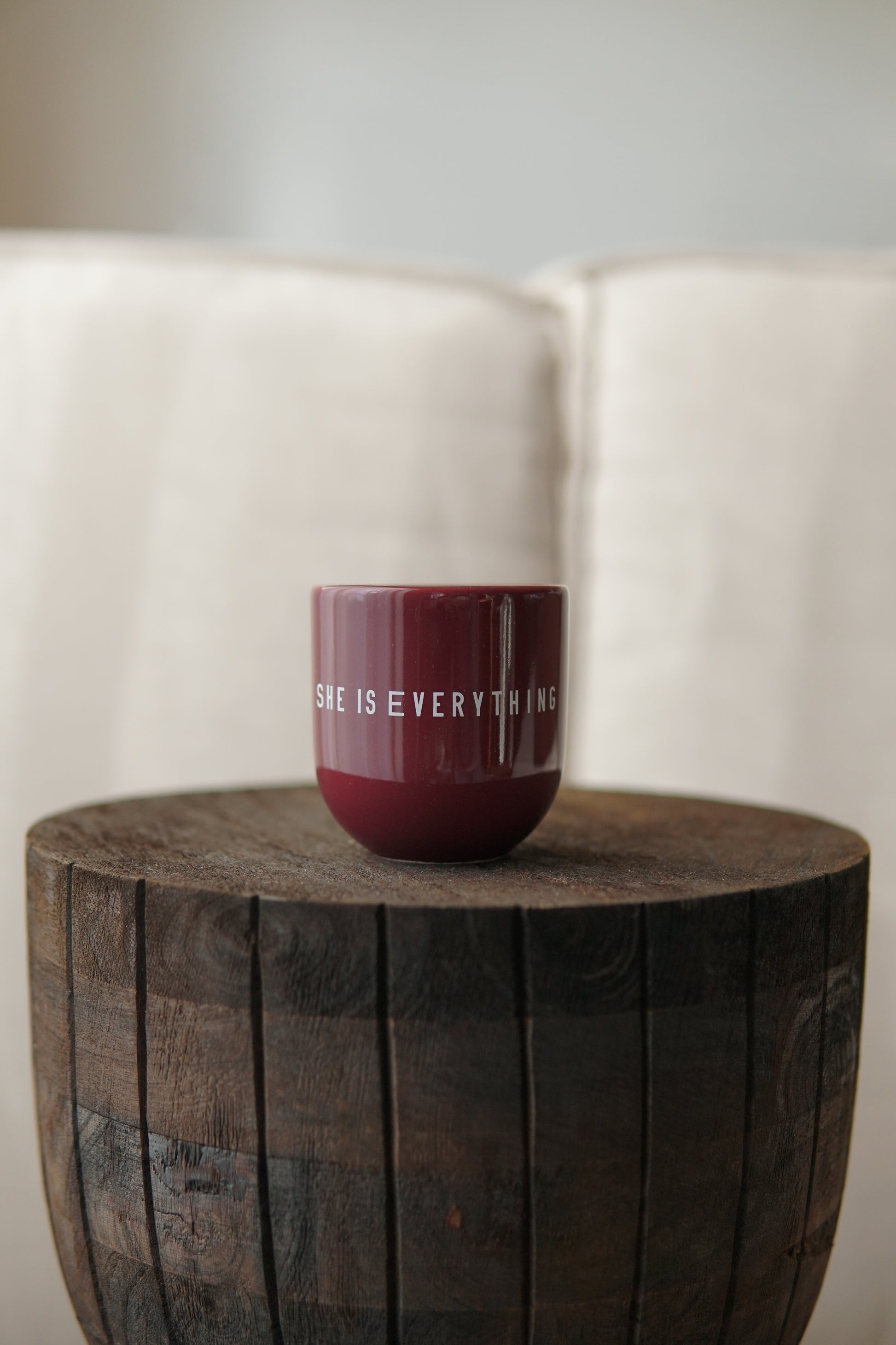 Burgandy glossy ceramic mug featuring the text "She is everything". This mug celebrates the special women in your life, making a thoughtful gift or a lovely addition to your collection.