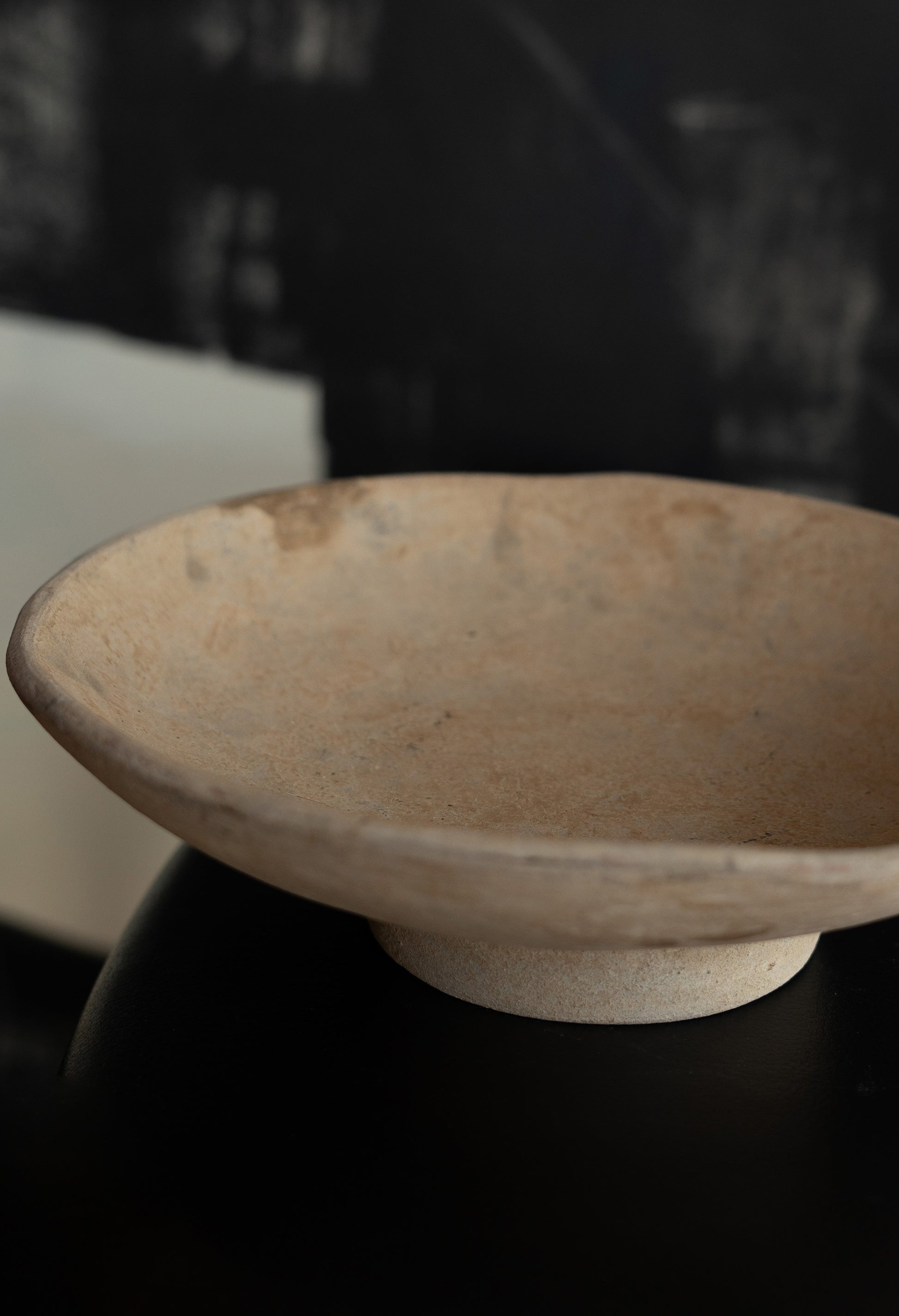 Handcrafted terracotta pedestal bowl with a low, wide profile and a matte sand-colored finish. Its minimalist silhouette and natural texture make it perfect for serving fruit or styling as a sculptural centerpiece.